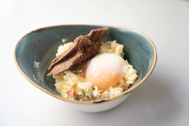- Huevo a baja temperatura con cremoso de patata, torrezno y aceite de pimentón.