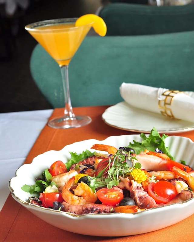 Camarão, polvo, tomate cereja, alho, azeite, azeitonas e vinho