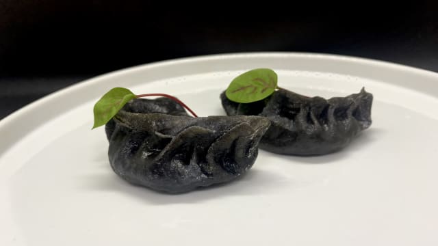 Ravioli al nero di seppia con gamberi e calamari