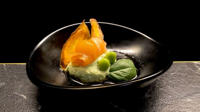 Sake edamame con gel al frutto della passione
