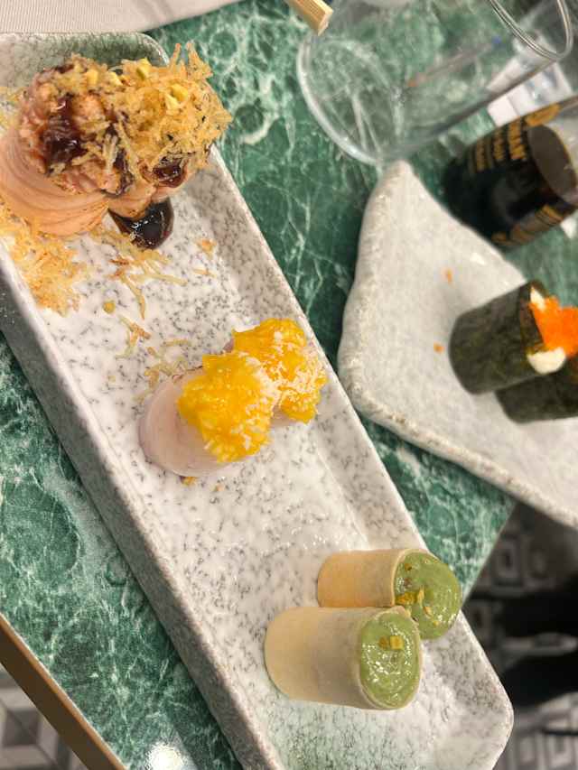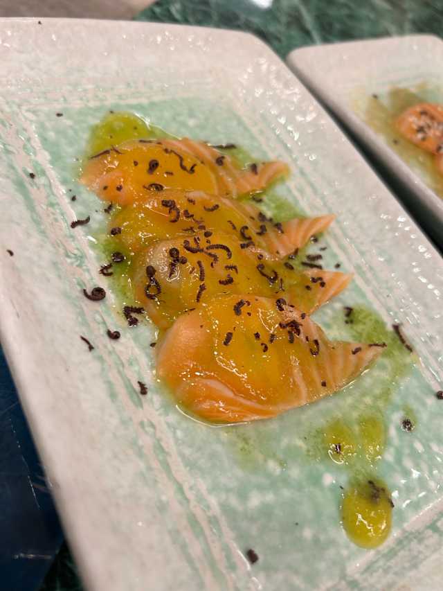 - Salmone, avocado, mango e gamberi cotti granella di pistacchio con salsa teriyaki e mango