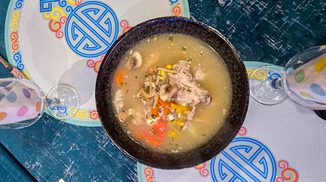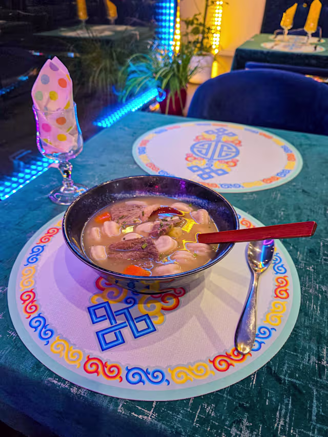 - Soupe aux ravioles artisanales et aux légumes - bouillon clair et parfumé, lentement infusé, composé de bœuf braisé à feu doux, ravioles artisanales, de pommes de terre fondantes, de carottes délicatement sucrées et d'oignons. Une interprétation raffinée de la soupe des campagnes mongoles.