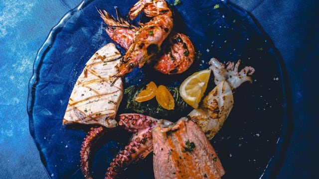 Oysters, tuna, purple shrimp, pink shrimp, scampi