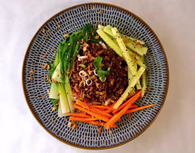 - Nouilles épaisse cuites à l'eau, accompagnées des carottes, pak-chois, concombre et bœuf haché épicé, le tout agrémenté d'une sauce maison.
