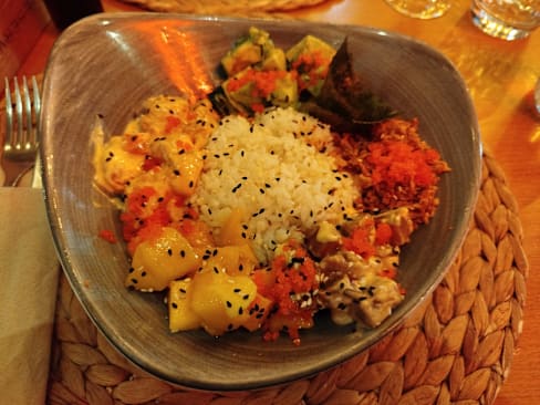 9/10This is our third visit to Mogno, which has an Asian slant with some Portuguese flavour. The lunch menu has changed since our last visit, so I really missed the prawn tacos (which were excellent), but apparently you can have them in the late afternoon menu. My friends' poke bowls were fresh and delicious and my chicken satay was also very tasty. On a good day, it's lovely sitting outside watching the world go by, while if the weather doesn't allow the inside is tastefully decorated. The staff are really sweet and helpful. Pity there's no sangria!