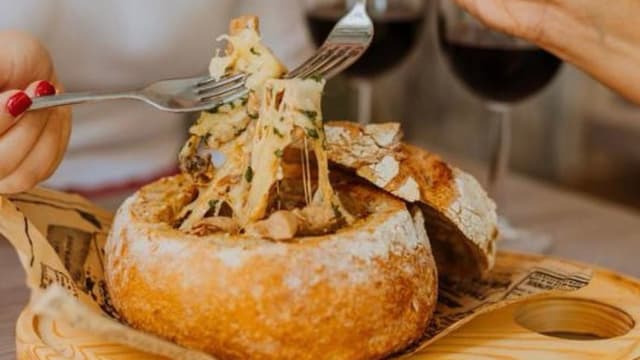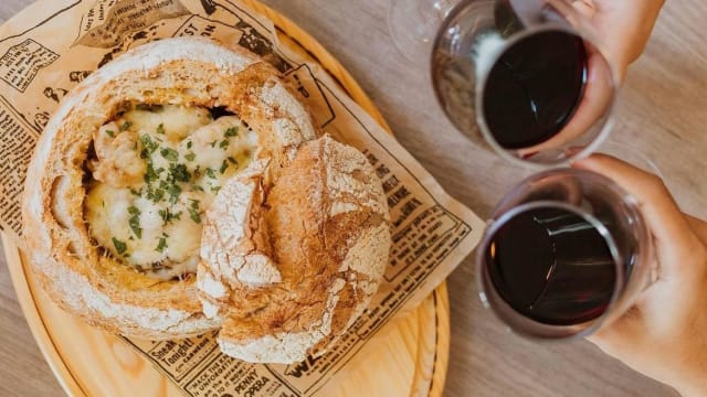 Sobre tosta mokambo de masa madre de larga fermentación + queso fresco de cabra fundido + mermelada casera de cebolla con trocitos de bacon + pera caramelizada con miel + topping de rúcula + pistacho finamente picado + mezclum verde + chips