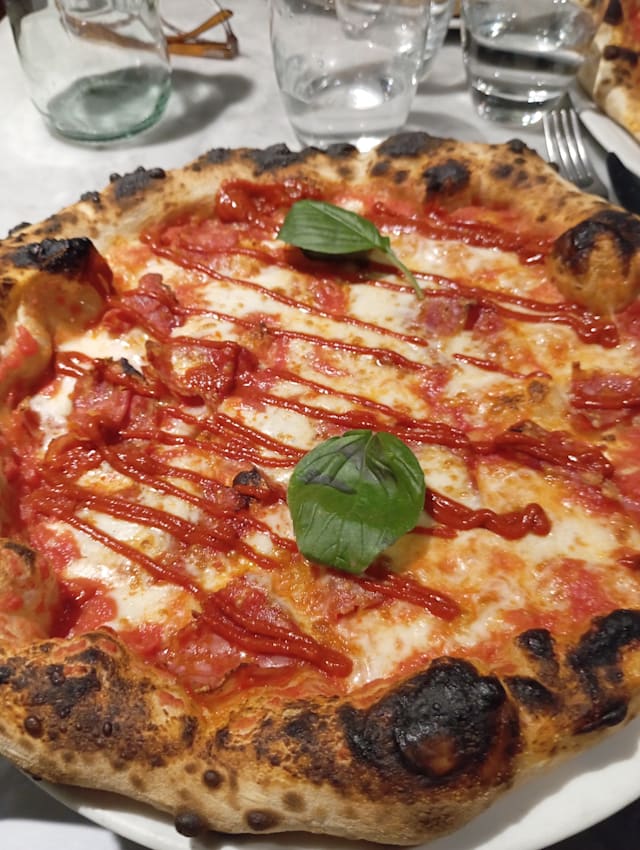 - Pomodoro, bufala, acciughe del cantabrico, capperi, olive taggiasche, origano e basilico