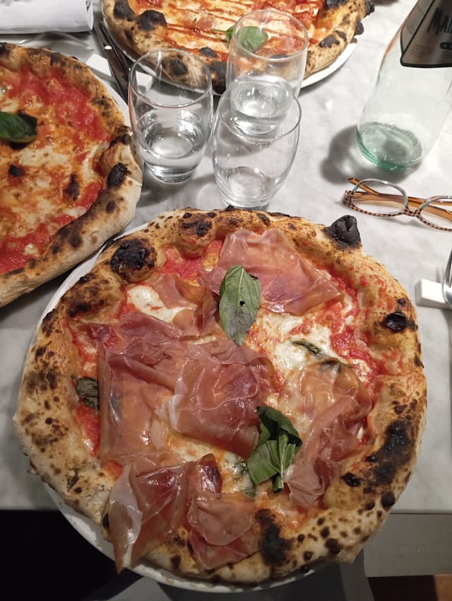 - Salsa di datterino giallo, bufala, prosciutto crudo, semi dry rossi
