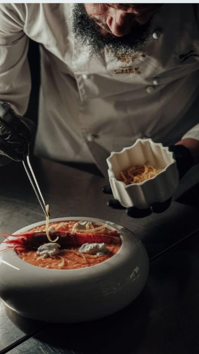 Risotto al gambero rosso,riduzione di champagne,zeste di limone e burrata di puglia