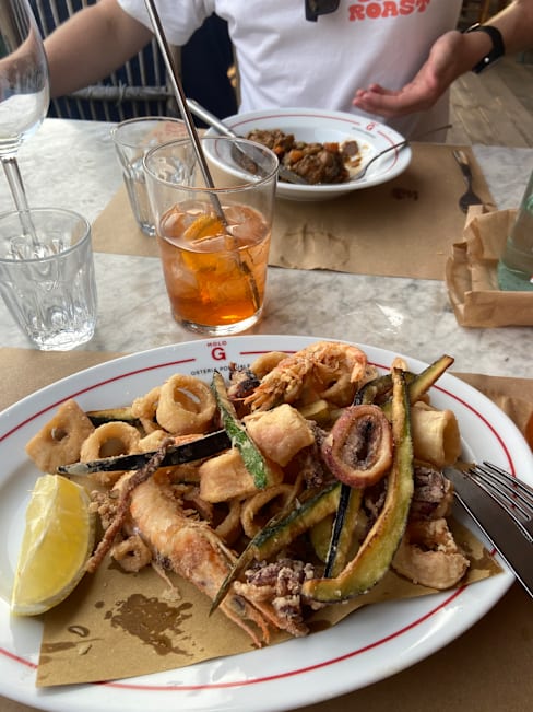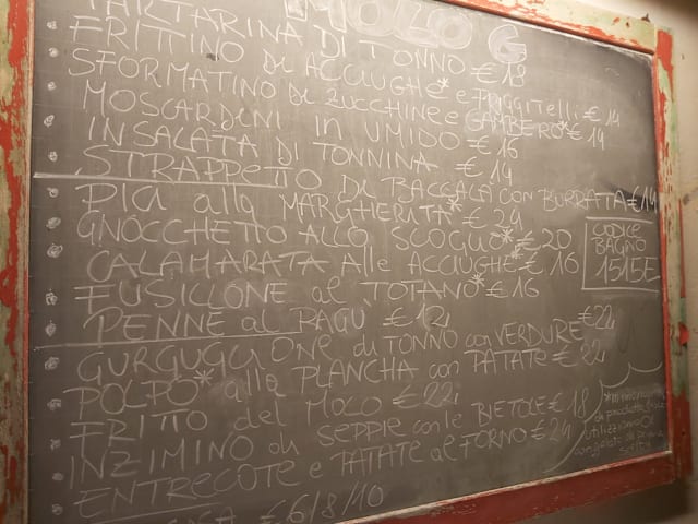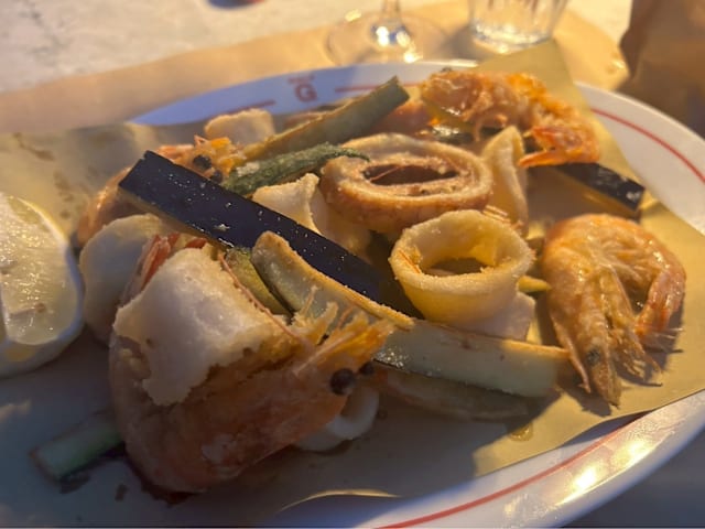 5/10Seafood fritto was sold as fresh, including octopus, but just prawns, squid and courgette / aubergine slices. Fine but the seafood was frozen and for over €20 a plate we found this very poor value. Perhaps better in the evenings? Music, wine (a local white) and surroundings were all fine.