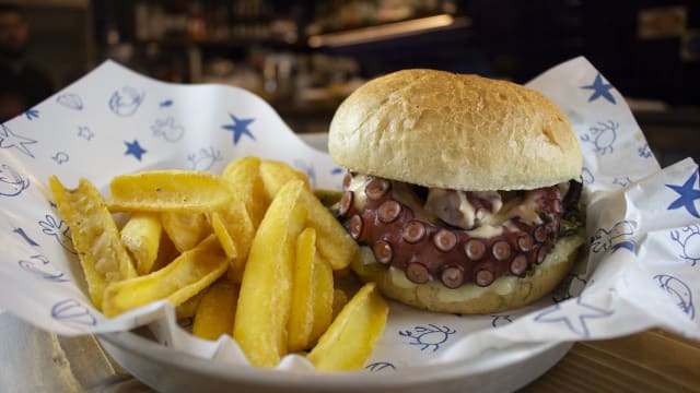 Polpo alla piastra, patate schiacciate al prezzemolo, pomodori secchi e mayo alla salsa verde. Accompagnati da patate fritte