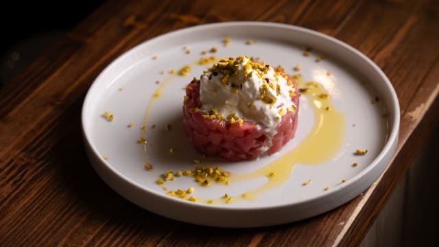 Tartare di tonno, stracciatella, salsa al peperone arrosto e cipollotto fresco. Accompagnati da patate fritte