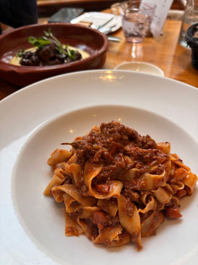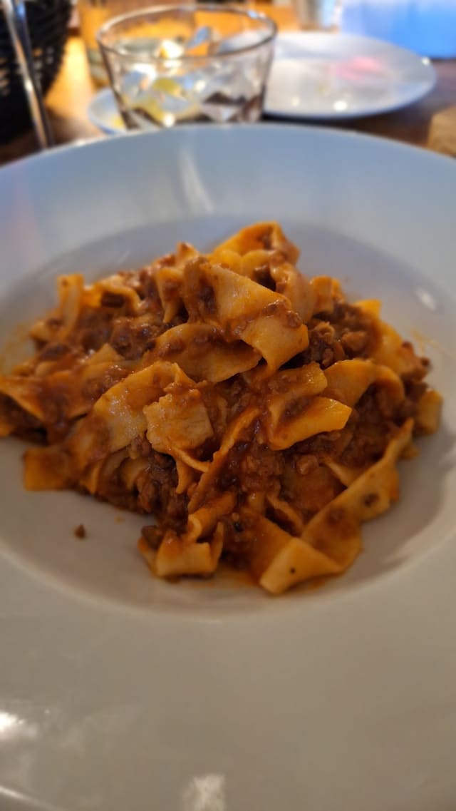 Huisgemaakt tagliolini met eend saus, kruidnagel, uien