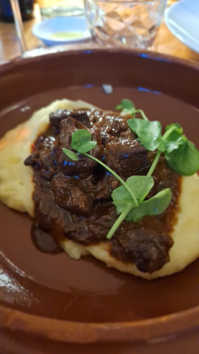 Gestoofde kalfswang in tomaten-paprikasaus, met aardappelpuree