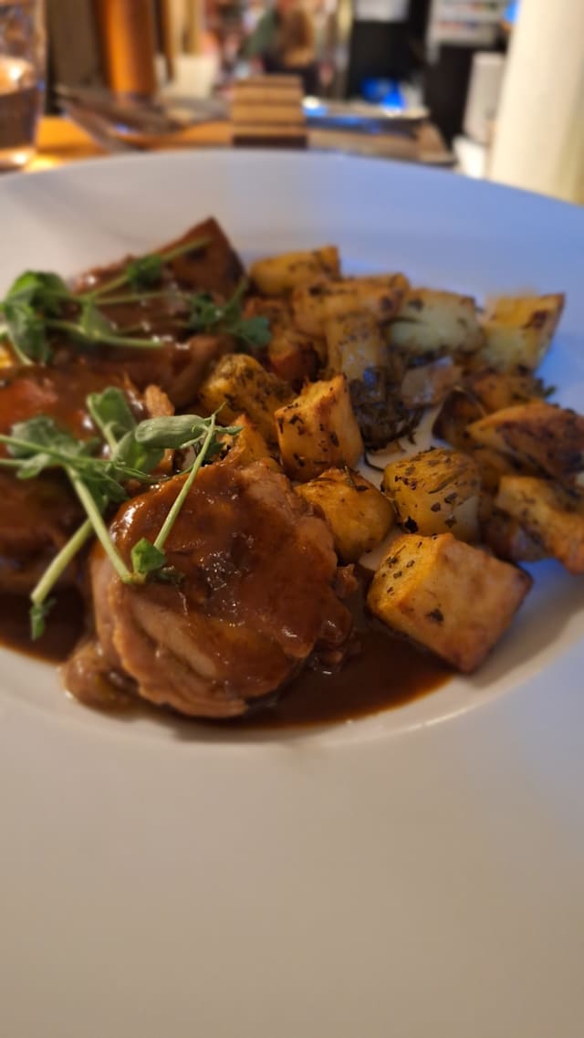 Coniglio in porchetta servito con patate arrosto e salsa demi-glace