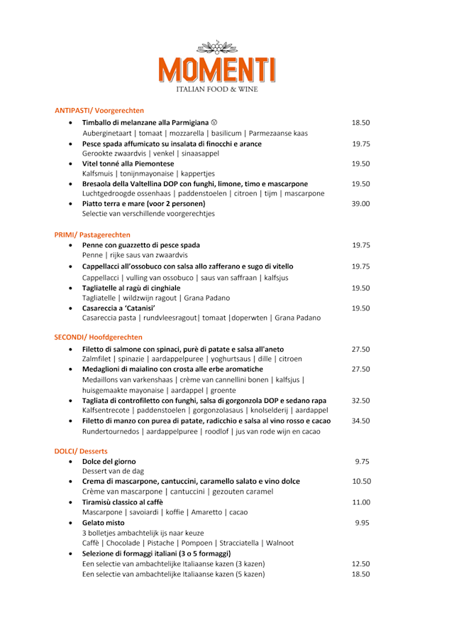 10/10Momenti, a place where you can take your moment with delicious food and well recommended wines. The service is generous and great to talk to. We had the 4 course diner - chefs choice. The tournedos was tender en very juicy. The white chocolate lava cake was heaven. It was perfectly warm en sweet. I've always respected the service here, because your glass is always full. They are attentive and take great care of your visit.