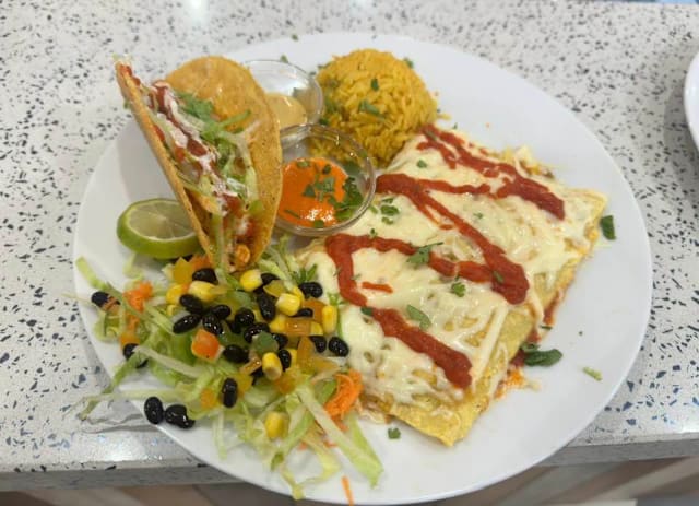 - Tortilla di mais giallo servita con fagioli rossi, riso messicano e salsa. Di pollo / di carne / difagioli, formaggio, insalata salsa pomodoro, e panna acida (3 strati)