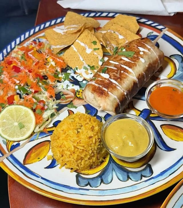 - Tortilla di farina arrotolata servita con fagioli rossi, riso messicano, insalata. Di pollo / di carne / di verdure crema di fagioli, insalata, formaggio, salsa di pomodoro, panna acida