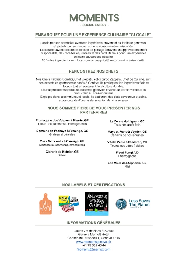 2.5/10A disappointing dining experience with family, particularly in a new hotel with worldwide reputation. Service is slow and unreliable, dishes are over-priced for a 4*, filet de perche from Valais at CHF 50+ for 6 meagre filets, loads of beans and fluffs of salad. Fries extra. Eating hall is like a cafeteria, too noisy due to lack of sound proofing and space separation. Not recommended. Go by the lake, better fish and for sure better moments