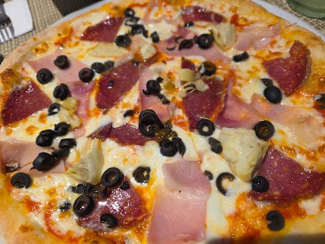 - Tomate, mozzarilla, jamón dulce, salami, ouvas negras, alcachofas