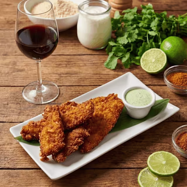- Cortes de pechuga de pollo rebozada, acompañada con una cremosa salsa de yogur cilantro y lima.