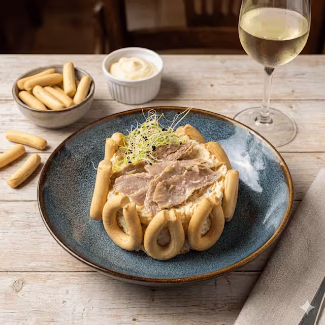 - La mezcla perfecta de patatas, zanahoria, huevos duros, pepinillos y aceitunas verdes con ventresca de atún y nuestra mayonesa ,acompañada de tostas y germinados de cebolla.