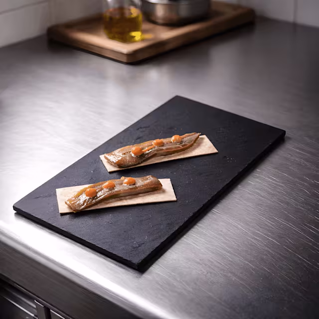 - Anchoa del Cantábrico en cama de tomate sobre crujiente de arroz y gelatina de perejil