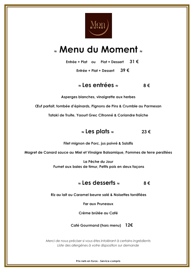 We love coming to Mon Bistrot! One of the best French foods we have had in the Paris area!
