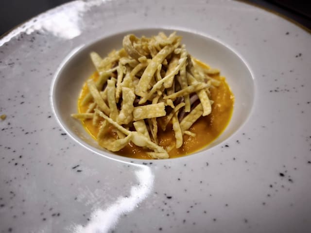 - Vellutata di zucca, pasta fritta e calamari