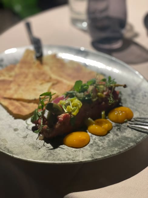 8/10Service was attentive, but courses were not all served at the same time. Quite of bit of noise from the bar during the meal and the restaurant was rather stuffy by the end of the evening. Food and wine selections were quite diverse in both type and price. Starters were overwhelmingly good but mains were lacking: the duck was not well cooked and for the price I would have liked to see at least one vegetable (no sides were offered). Overall good but not great.