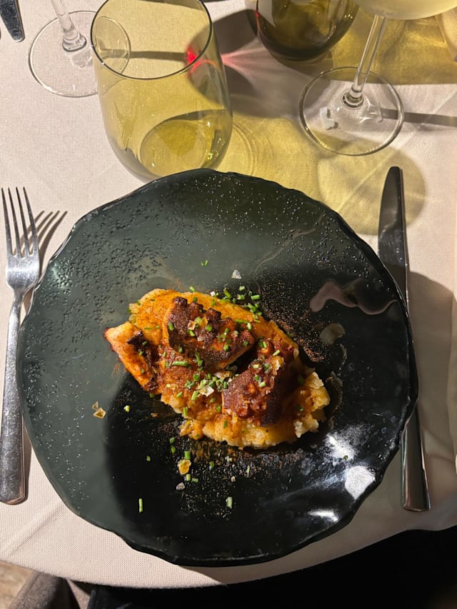 Vieiras con papada ibérica confitada, cremoso de patata y aceite de trufa