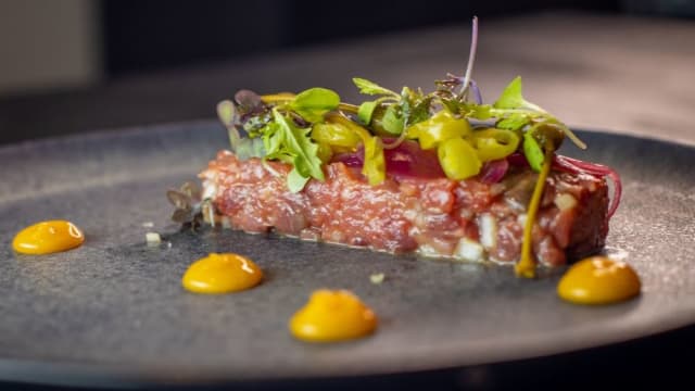Steak tartar con yema de huevo curada, encurtidos y pan Sardo