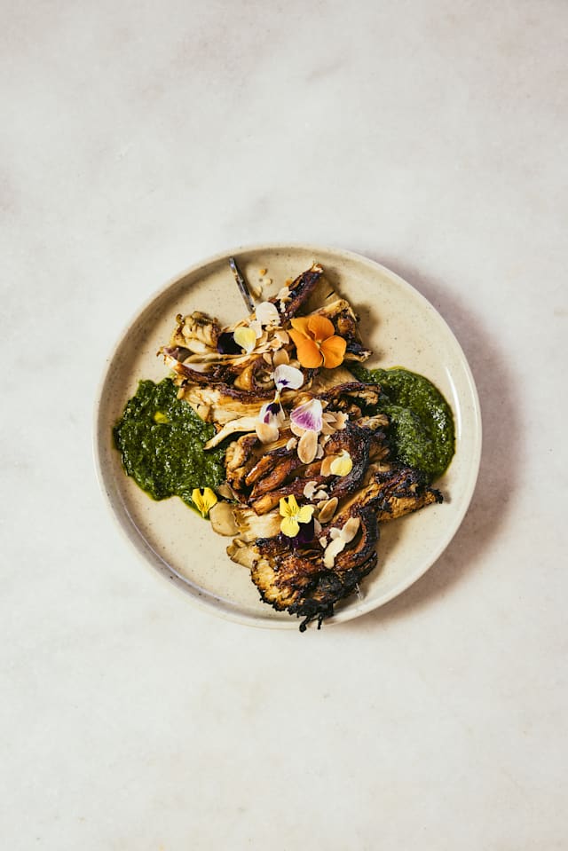 Skewered grilled oyster mushrooms with a rich miso glaze, served with a fresh, herbaceous salsa verde