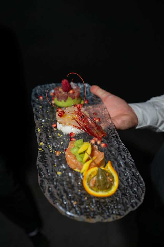 - Bis carpaccio spada e tonno affumicato con frutti di bosco e salsa al rum