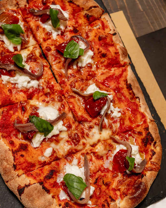 - Base rossa, fior di latte, pomodorini secchi, alici del cantabrico