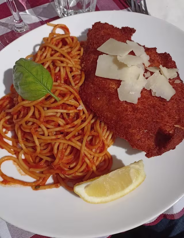 - Escalope de dinde panée, spaghetti tomate, grana padano.