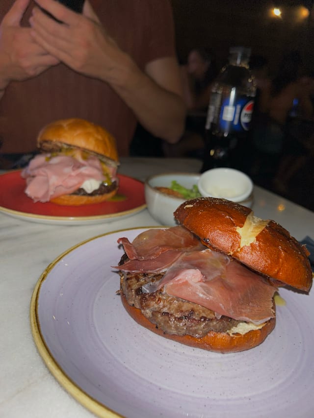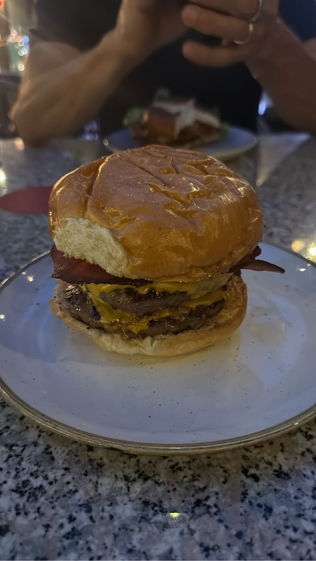 Due hamburger da circa 200gr. cad., doppio crispy bacon, forma io cheddar e monster secret sauce.