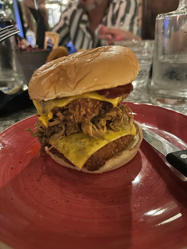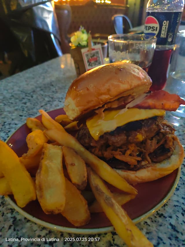 Un hamburger da circa 200gr., forma io cheddar, spalla di maiale in salsa bbq affumicata e sfilacciata a mano e monster secret sauce.