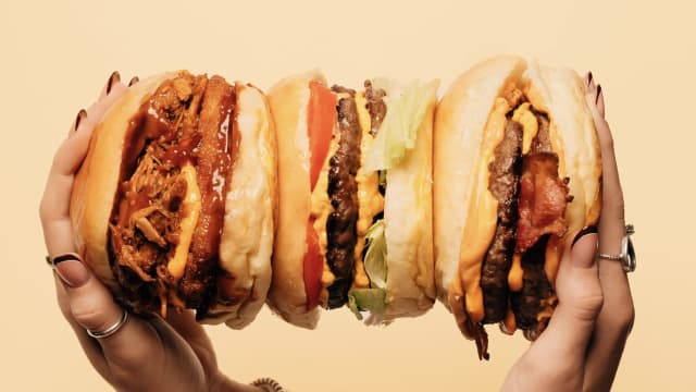 Uno o due hamburger da circa 200gr. cad., monster secret sauce, cipolle rosse caramellate, formaio cheddar, cetrioli, pomodoro, insalata.