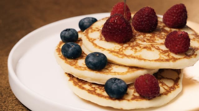 Waffle con croccante petto di pollo da circa 200 gr con frutti di bosco freschi, sciroppo d acero e bacon.