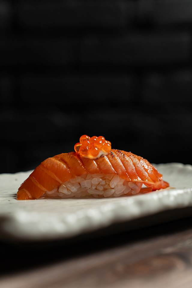 - Salmón, aguacate y queso crema, cubierto de huevas de salmón