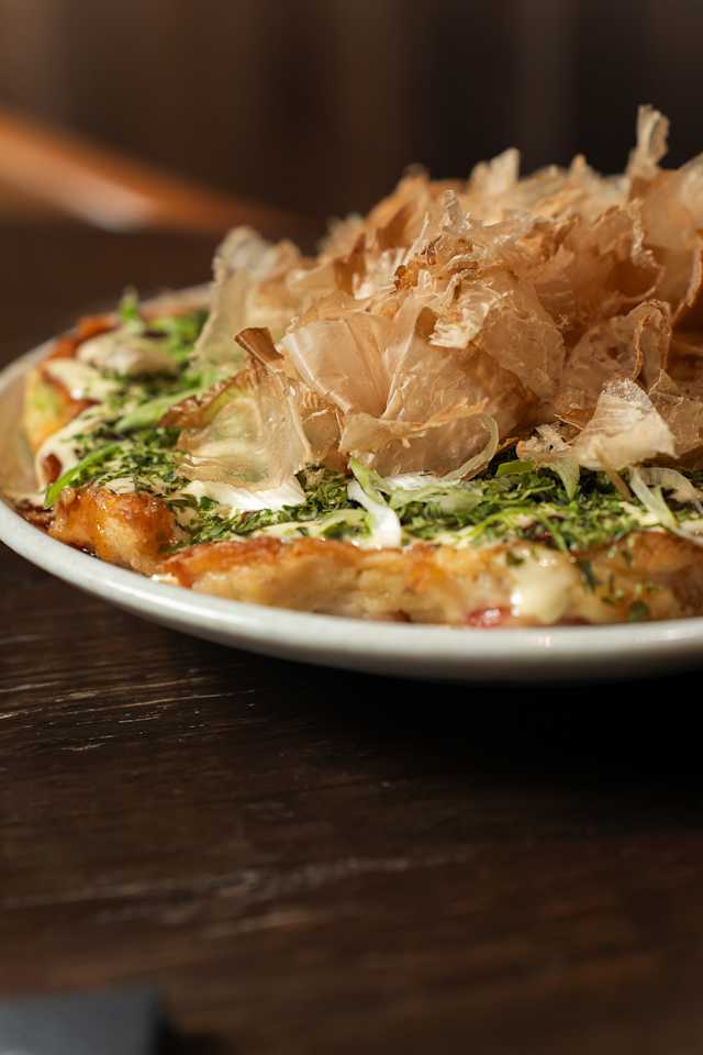 - Pizza japonesa al estilo osaka, con trocitos de bacon, katsuobushi y salsa okonomiyaki.