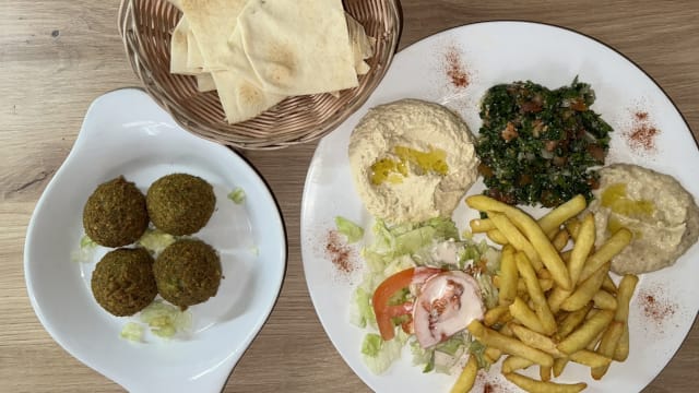Pois chiches, fèves, ail, coriandre, accompagné de taboulé, moutabal, hommos, salade, frites ou blé