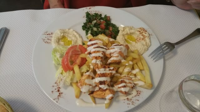Accompagné de taboulé, moutabal, hommos, salade, frites ou blé