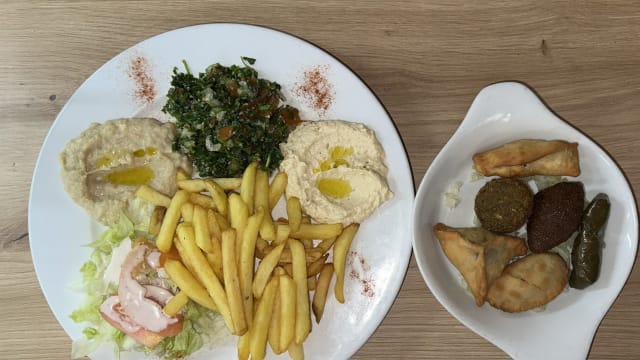 Fatayer, falafel, et feuille de vigne, accompagnés de taboulé, hommos, moutabal, salade, frites ou blé