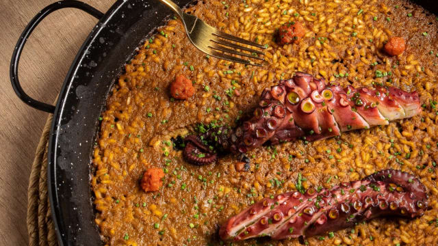 (mínimo 2 personas) arroz con pulpo hecho con un sofrito de sepia, pimiento, cebolla y sobrasada. Para poner encima de pulpo: aceite verde (perejil,menta y albahaca) cebollino.
