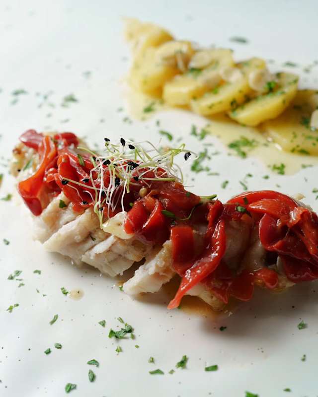 - Merluza pintxo de burela a la plancha con puré de boniato