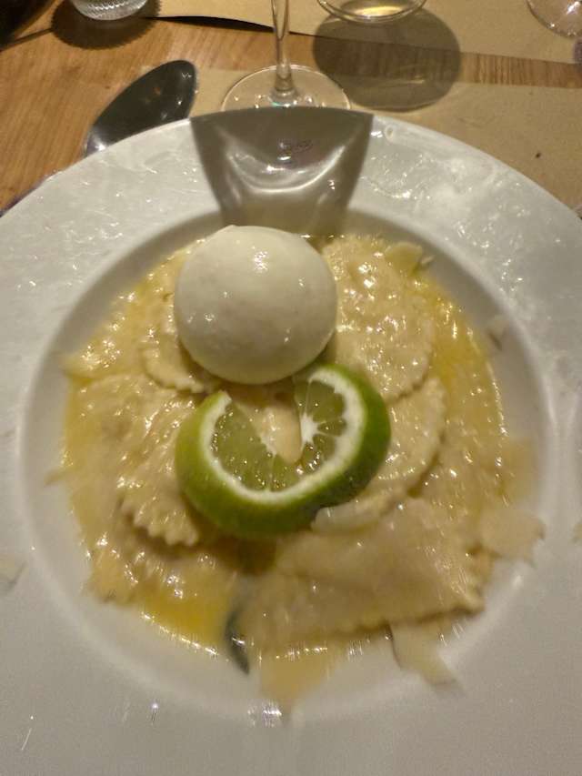 - Pâtes farcies au chèvre et miel avec crème de gorgonzola et pistache