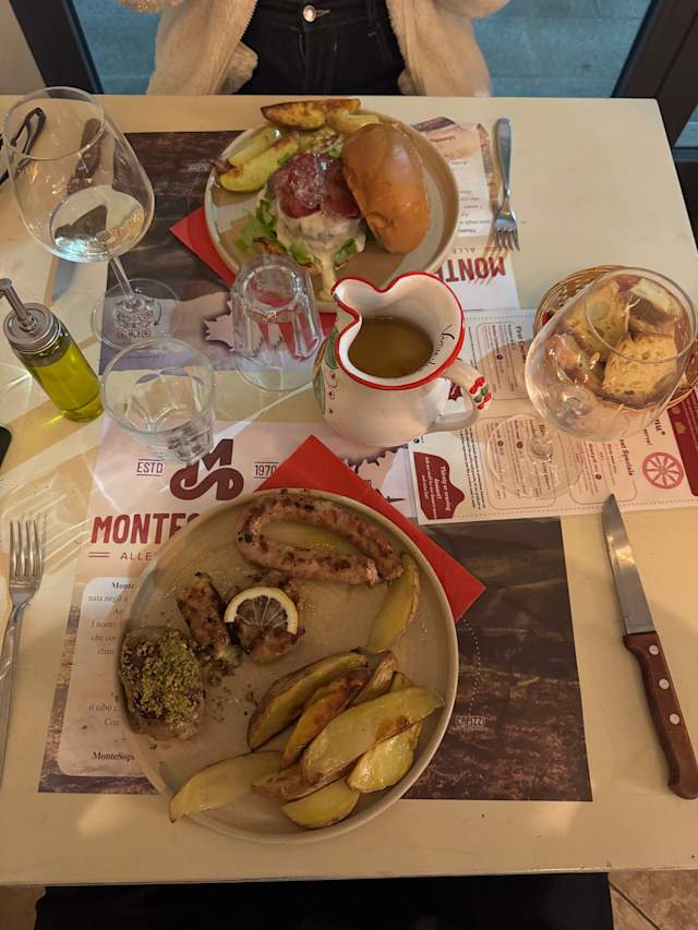3/10What a miserable experience. After browsing through countless menus, my husband and I decided to spend our anniversary dinner at Montesoprano. Though we had never been there before, the food selection sounded good so we were excited to give it a go. Sadly, the dinner was an absolute let down. Firstly, it was exceptionally difficult to get any attention from any serves, and even when we did, we had to ask for things such as water and ice several times before they were actually brought to us. As an appetizer, we shared the eggplant parmigiana which was nothing to rave about but still the best dish of the night. My husband got what was described as a hamburger as a main and I got two different salads, reitterating that I'd like the dressing to be served separately, so I can decide how much I want to add myself. When the mains arrived, we were in for quite a surprise as my husband did not receive a 'hamburger' but simply a burger a.k.a. just a beed patty with some sad looking leaves as