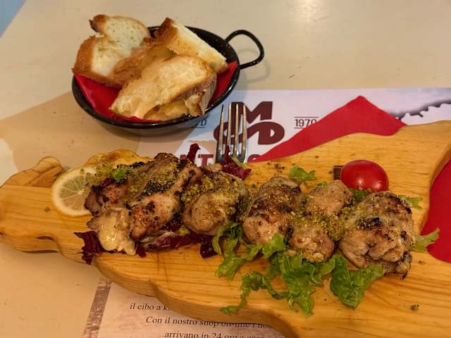 - Involtini di suino impanati, ripieni di crema di formaggio, primo sale e pesto di pistacchio